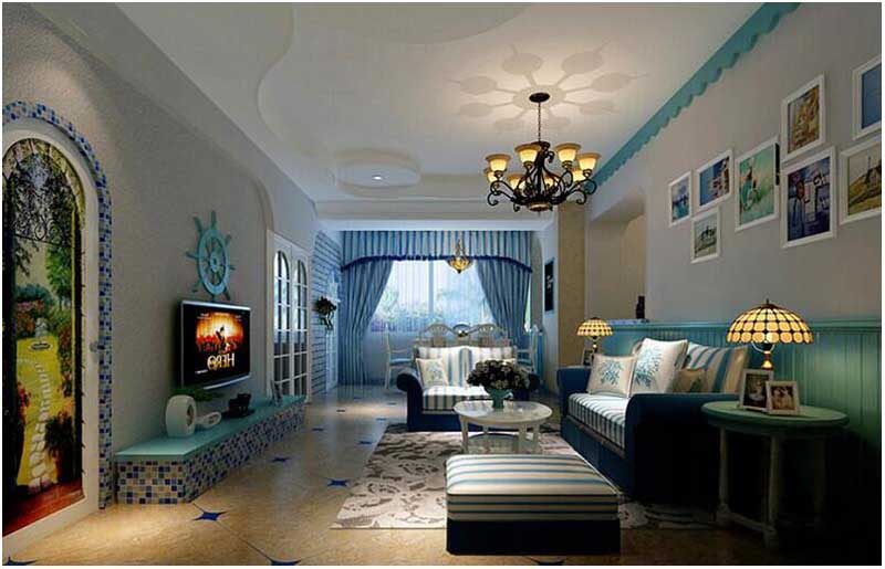 地中海風格的客廳裝修不同國家有不同的文化習俗,因而房子客廳的裝修也有了不同的風格及特色,下面介紹一下地中海周圍國家客廳的裝修風格——地中海風格地中海風格在選色上一直以自然的柔和色彩為主,在設計組合上注意空間的充分利用和顏色的搭配??矗@幅圖就很好闡釋了地中海風格的特點,具有海洋顏色的沙發(fā),淡藍的窗簾,就連墻面上也是微藍的。