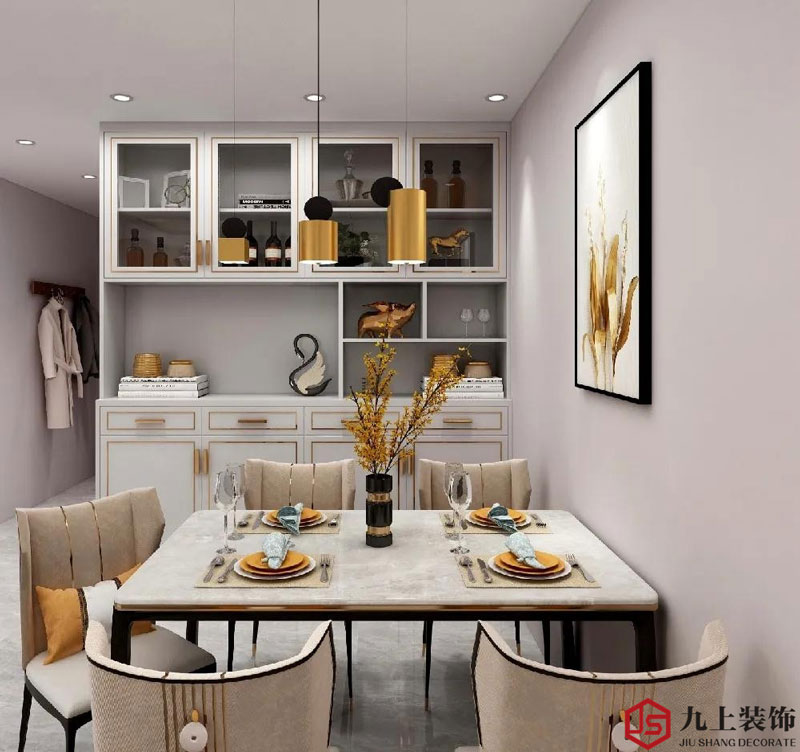 餐桌是石材的,擺放了 6 把扶手椅,簡約而又優(yōu)雅的宜人尺度,搭配上天花一盞金色吊燈,整個空間顯得格調(diào)滿滿。