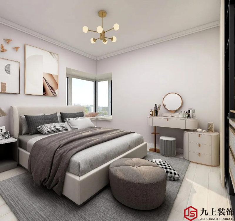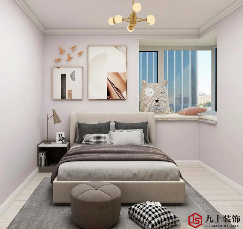 墻面采用低飽和度的色調(diào),與木飾面做了一個拼接,搭配上金色的落地?zé)艉秃喴椎拇差^柜,營造出溫馨舒適的空間氛圍。