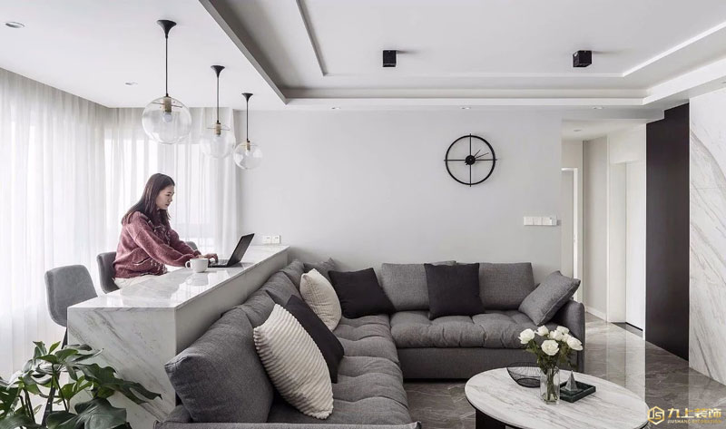 沙發(fā)側(cè)墻背景沒有掛裝飾,用造型掛鐘取代,簡約與實(shí)用并存