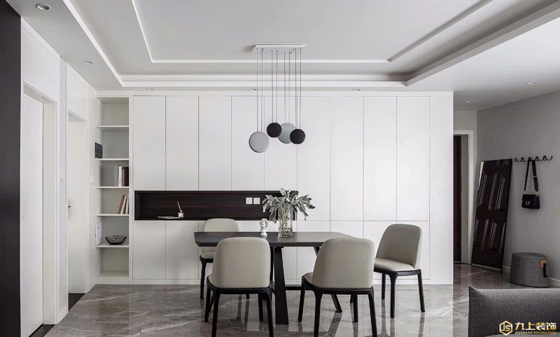 入戶單獨(dú)放置換鞋凳,衣帽鉤和穿衣鏡,置物格和餐邊柜連成一面整體