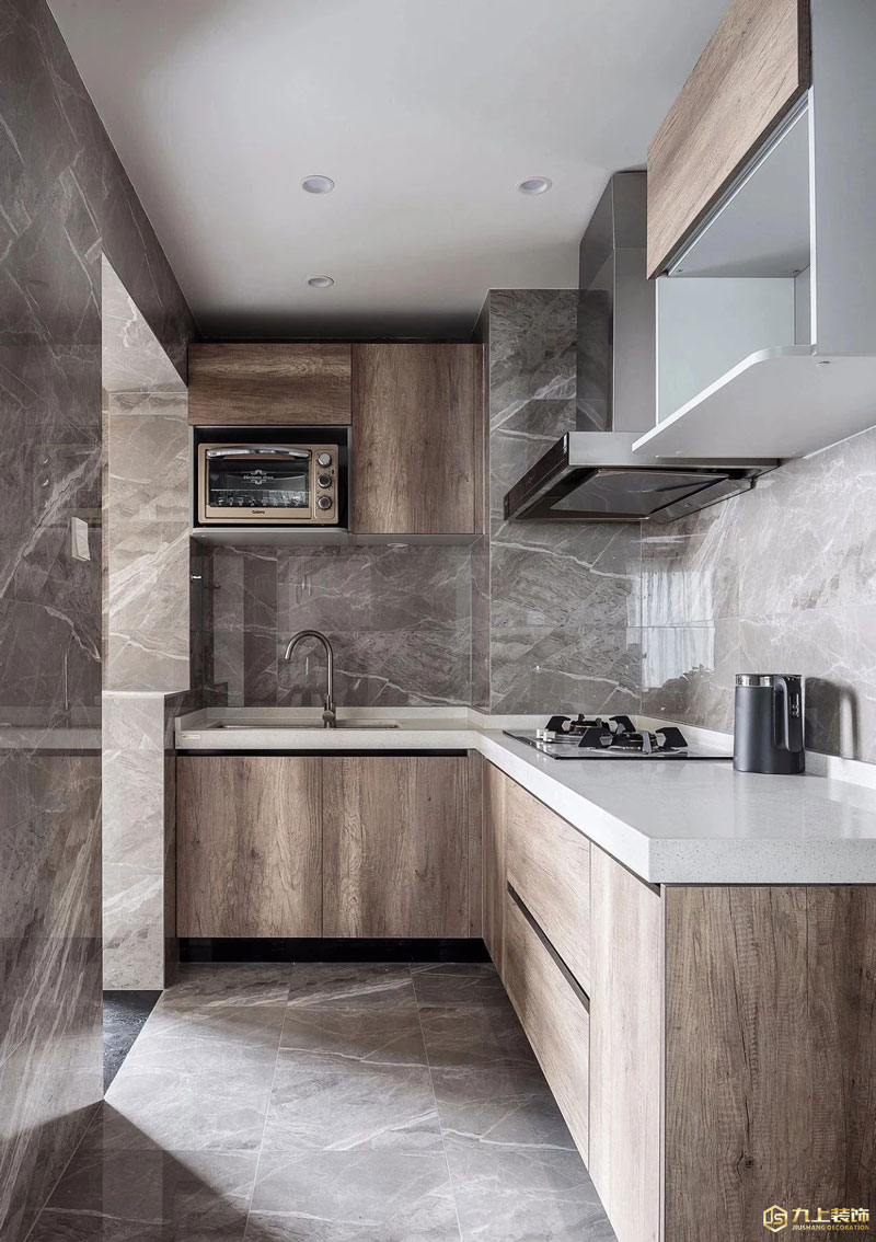 廚房沿用客廳地磚整鋪,選擇舊木紋櫥柜門,中和大面積石色空間的冰冷感