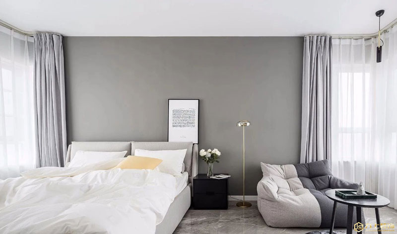 主臥背景墻采用現(xiàn)代而精致的煙灰色,搭配亮白色床品,讓空間更為潔凈舒適
