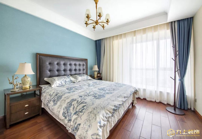 主臥背景墻使用了馬卡龍藍(lán)色,與窗簾的淡藍(lán)色不同,兩種不同的藍(lán)色表現(xiàn)出了層次感,也與深色的家具形成對比,整體優(yōu)雅內(nèi)斂。