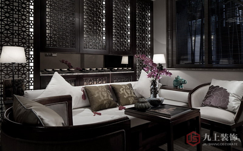 客廳實(shí)木沙發(fā),黑色木制與白色布衣,鮮明對(duì)比,視覺沖擊大,裝飾陶瓷擺件,格局大氣富有質(zhì)感。