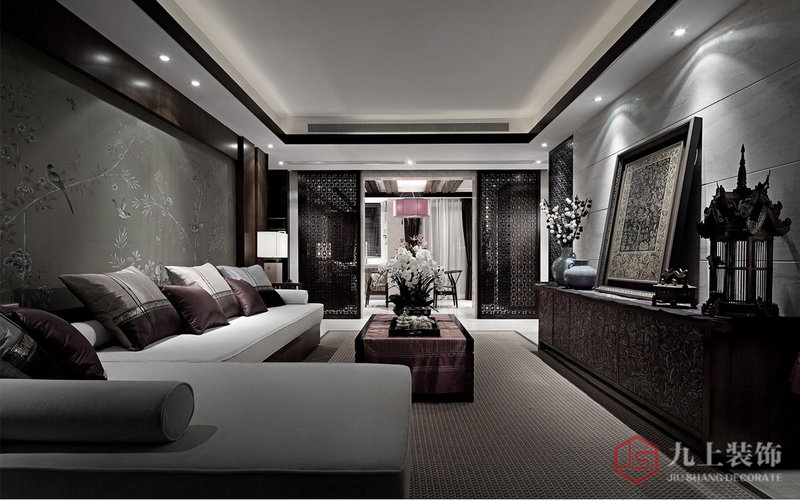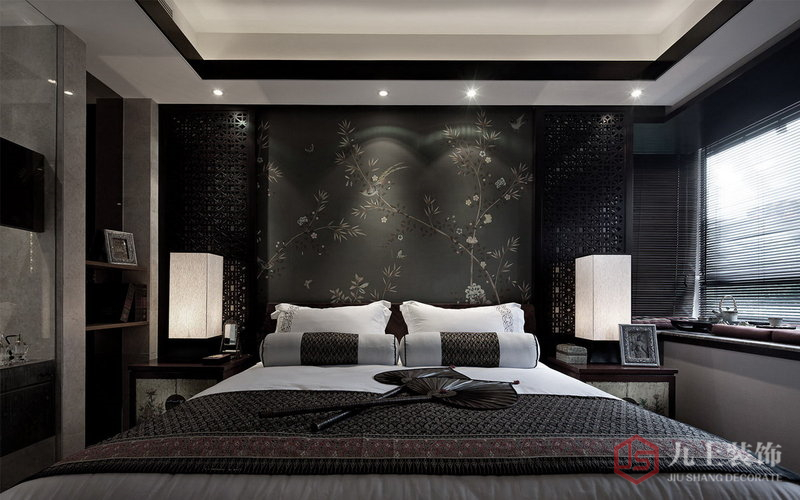 臥室延續(xù)風(fēng)格,墨色背景點(diǎn)綴純白色,視覺沖擊的同時(shí),實(shí)木鏤空墻,以及對(duì)稱的格局,顯示高雅大氣的格調(diào)。