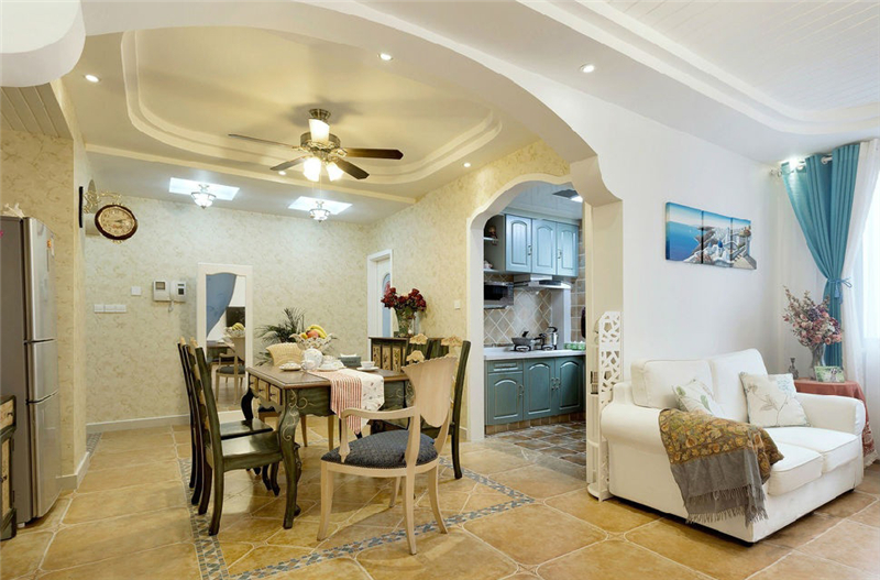 餐廳的天際以弧形線板勾勒出大氣祥和,一把吊扇復古精致地帶出地中海韻味。
