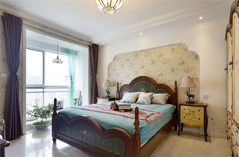 主臥以復古家具形塑出歐式風情,落地窗戶使得空間顯得開闊寧靜,加以盆栽點綴和墻面壁紙的淡雅花叢,一派春意盎然景象。