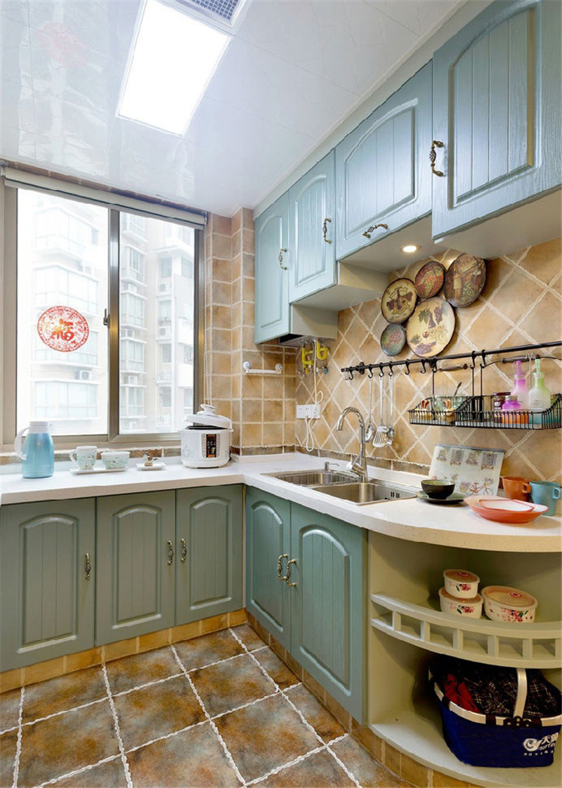 廚房溫馨淡雅,疏通的空氣透過窗戶引進室內(nèi),保證下廚環(huán)境潔凈清新,吊柜和櫥柜設計一體化,滿足不同功能廚具、材料的收納。