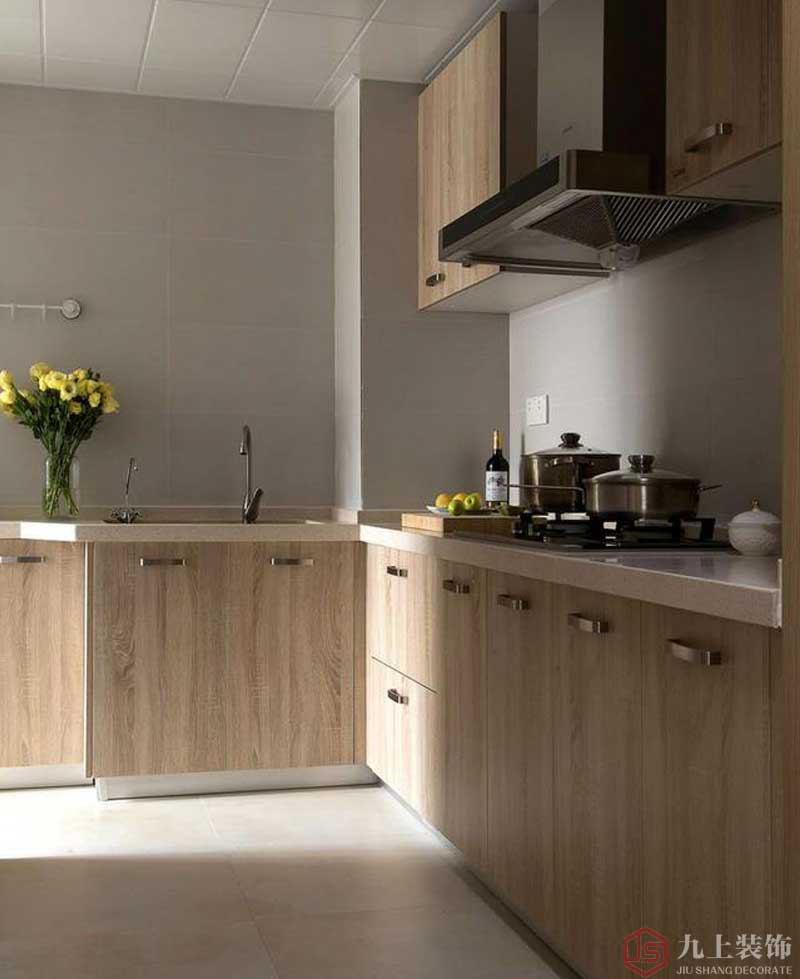 廚房裝修也是清一色的白瓷磚+原木櫥柜,廚房空間干凈整潔
