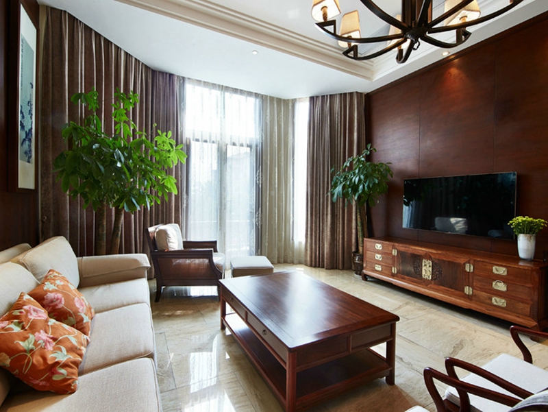 沙發(fā)、電視處都擺放了發(fā)財(cái)樹(shù),寓意富貴吉祥,這款電視背景墻與以往不同,是采用實(shí)木木板,是不是很有創(chuàng)意。