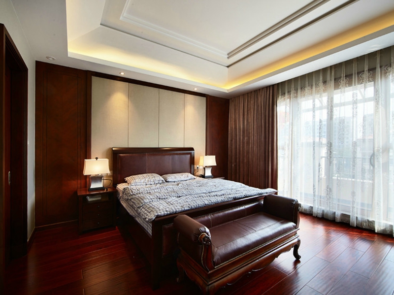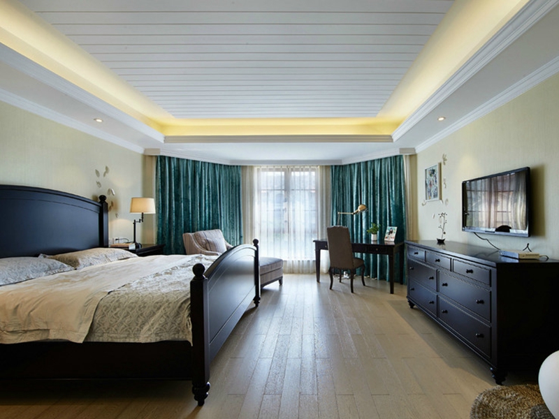 次臥就相對(duì)簡(jiǎn)單,應(yīng)該是用當(dāng)客房的,但基本的實(shí)木地板+長(zhǎng)形吊頂是標(biāo)配。