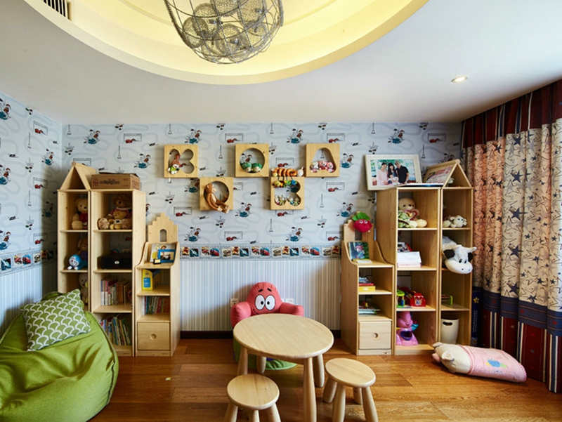 孩子的天堂,全屋實(shí)木家具,兒童畫(huà)壁紙裝飾,實(shí)木收納柜,裝納很多玩具。