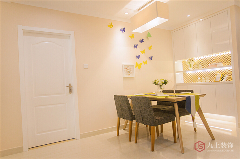 溫暖的色調(diào),簡約的木制家具,簡單大方,墻上的彩色蝴蝶,讓整個(gè)室內(nèi)充滿生機(jī)。