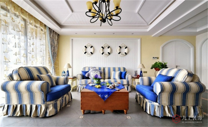 沙發(fā)背后的墻面采用淺黃色乳膠漆,墻中間用白色做局部造型,掛上三個(gè)救生圈,與地中海主題相輝映。