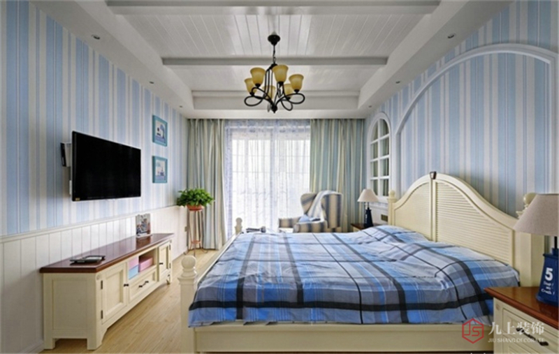 臥室墻紙為淺藍(lán)色豎條紋,與條紋窗簾非常搭配。窗邊的綠植給私人空間帶來新鮮的氣息。