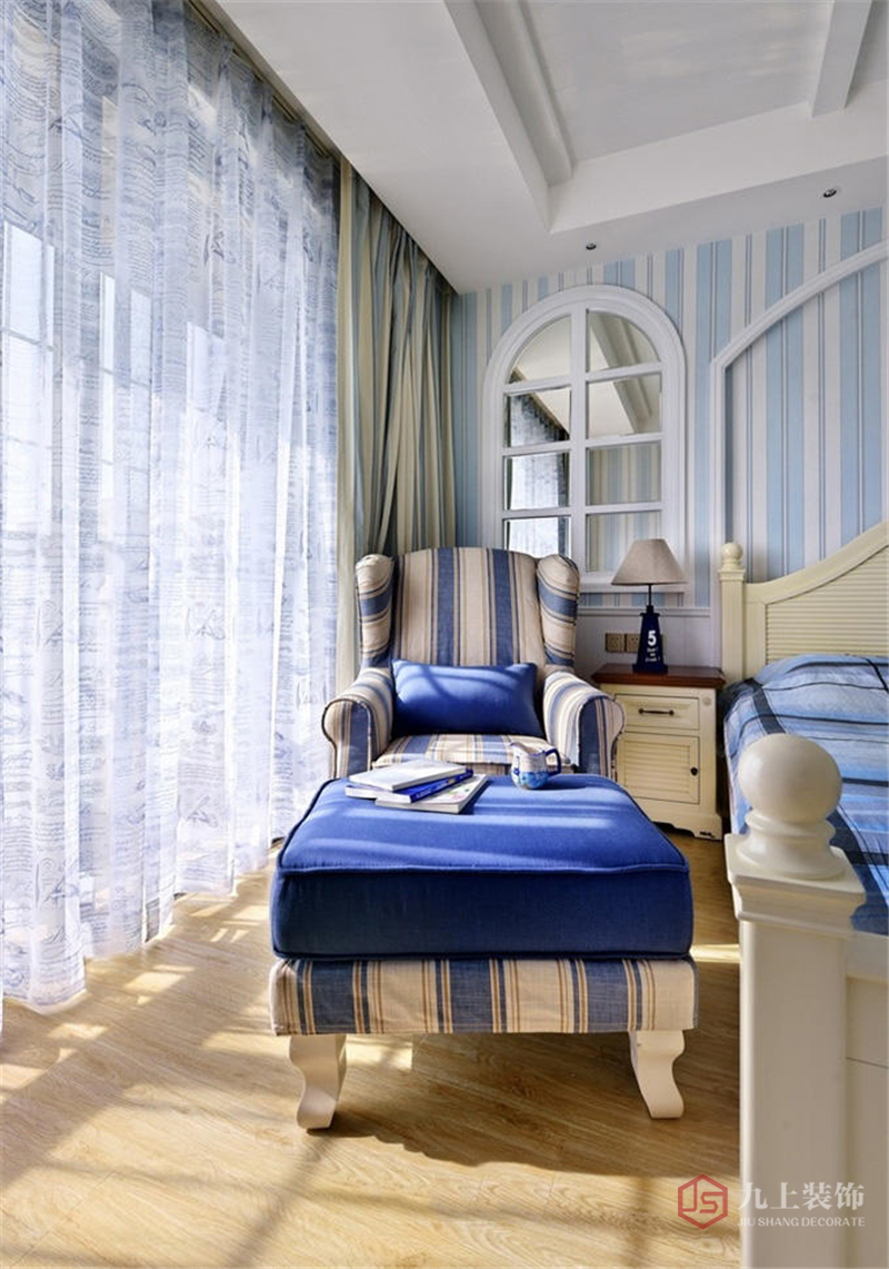 陽臺(tái)邊的沙發(fā)椅和沙發(fā)凳與床上用品的顏色也十分搭配。床頭柜上方的鏡子做成拱形窗戶的樣式,具有地中海風(fēng)情。