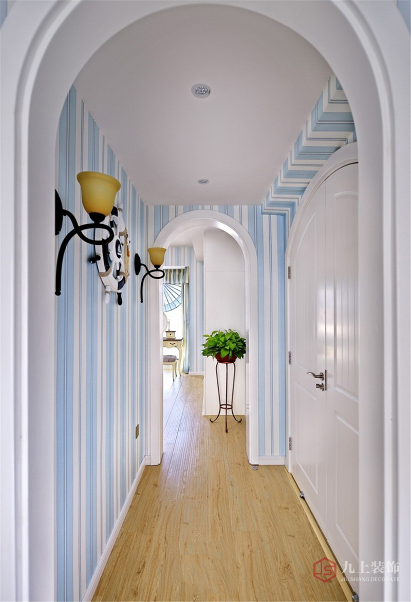 “地中海風(fēng)格”對(duì)中國(guó)城市家居的最大魅力,來自其純美的色彩組合。這套裝修案例顏色以藍(lán)與白為主,在裝飾方面融入了多種海洋元素,還有弧形鏡子和拱形門的應(yīng)用,極具地中海特色。