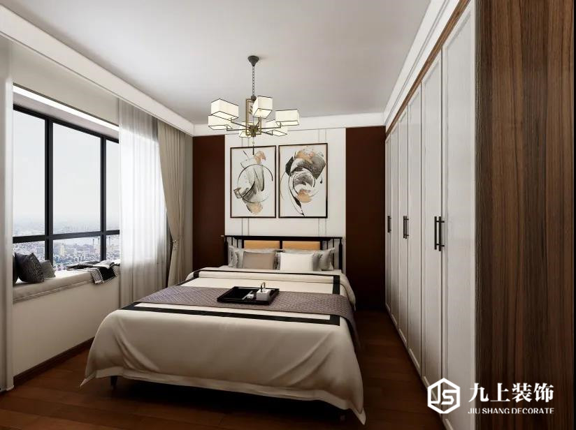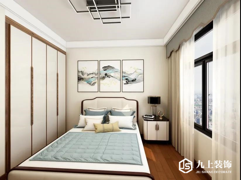 電視背景墻、沙發(fā)背景裝飾畫古色古香,再搭配新中式家具,吊燈,整體格調(diào)富有韻味。