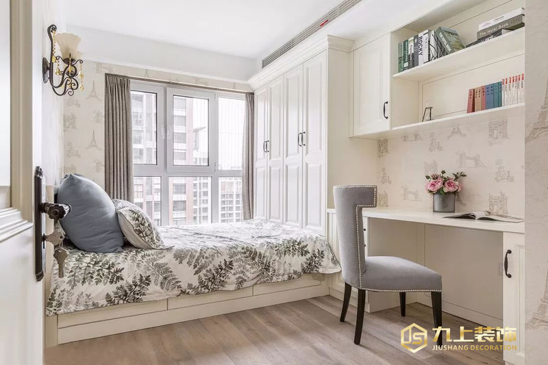 榻榻米床鋪與衣柜、書桌設(shè)計(jì)一體化,最大限度地利用了空間,多種功能隨意切換,淺色系裝飾清新自然。