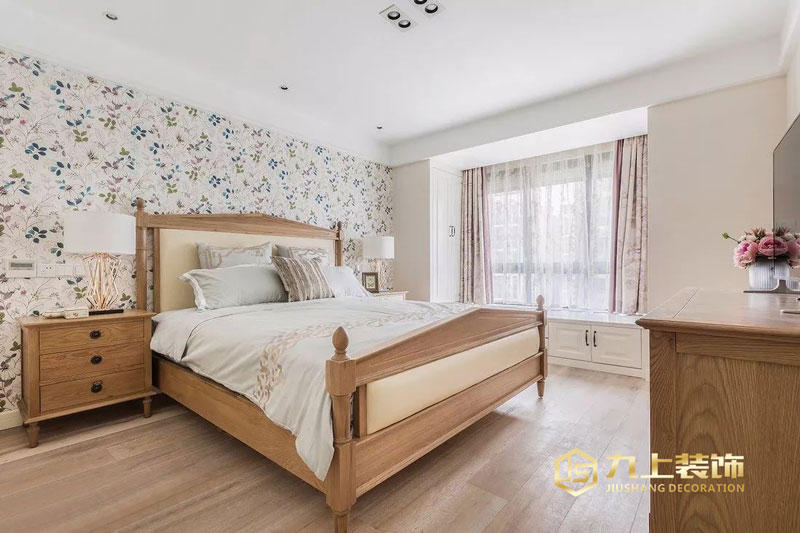 臥室采用 原木色溫潤實(shí)木家具、清新碎花墻紙,淺色系床品,打造溫馨柔和的休憩之所。