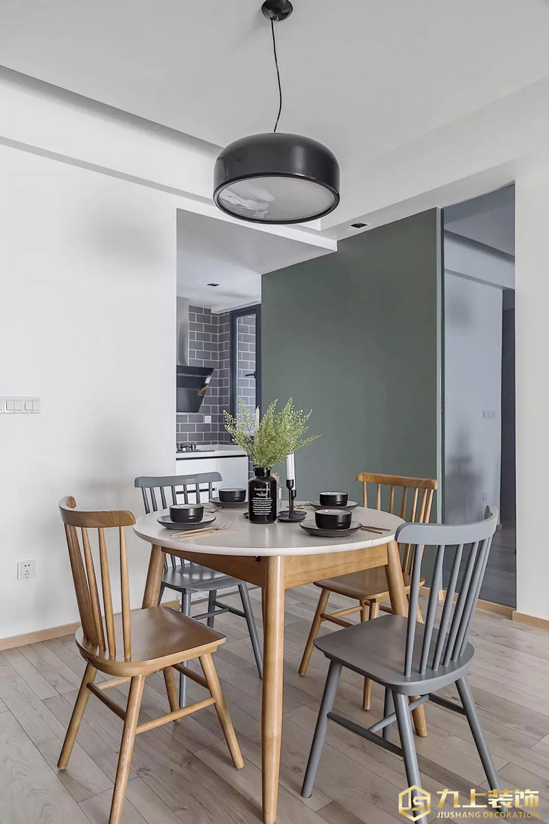 原木色和淺灰的餐椅相間擺放,黑色的玻璃瓶里插著滿天星,讓主人在用餐時(shí)也感覺得到素凈純粹。