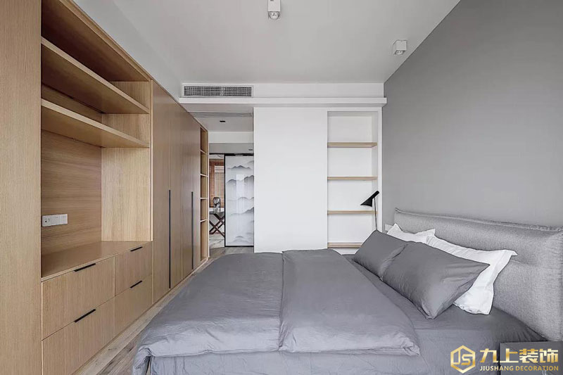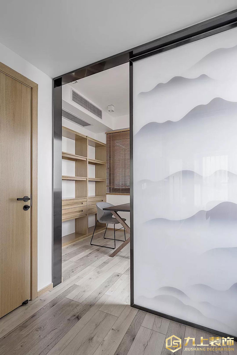 仿屏風(fēng)式潑墨色峰巒圖案的推拉門,給臥室開辟了一間小書房,把工作和生活區(qū)分開來。