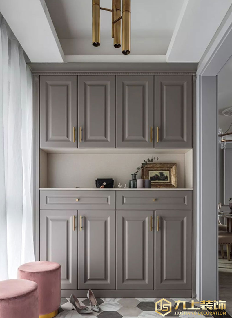 玄關(guān),粉色獨(dú)凳配以一體式墻柜,中間鏤空設(shè)計(jì)方便日常使用,配以漸變6角方磚,簡單輕松。