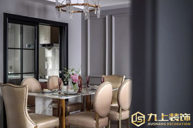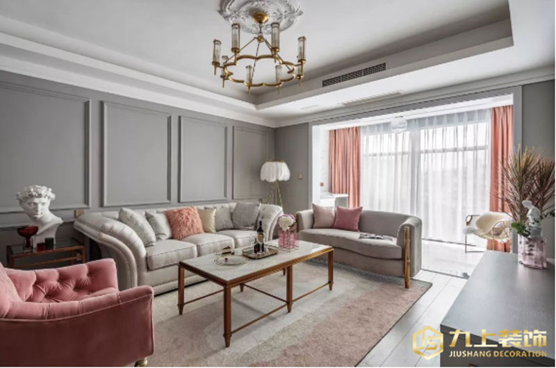 美式沙發(fā)散發(fā)出濃濃的美式優(yōu)雅,灰粉色系地毯搭配米色沙發(fā)色調(diào),配以高腳茶幾,整體空間簡單大氣。清新淡雅在空間里彌漫。