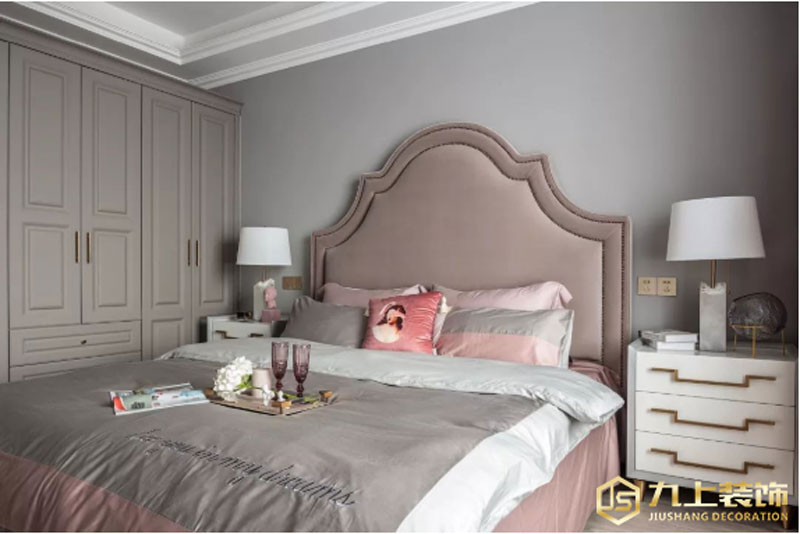 灰色一體式衣柜滿足空間收納能力,衣柜色調(diào)與整體空間色調(diào)和諧,空間充滿童話質(zhì)感。
