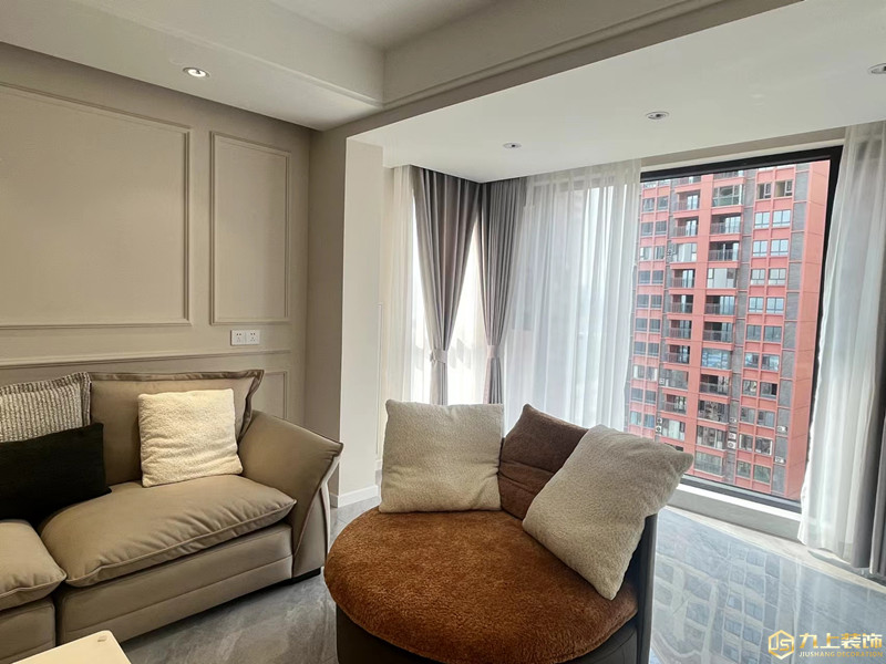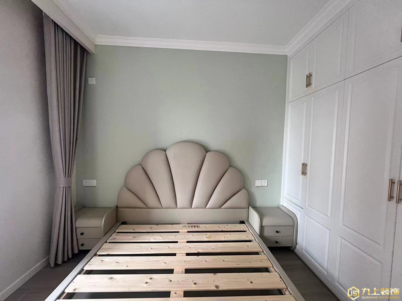 主臥,淡綠色的背景墻色調,營造出溫馨感,延續(xù)公共區(qū)域的氛圍,弧形分色處理的吊頂弱化飄窗頂的同時增加空間層次感