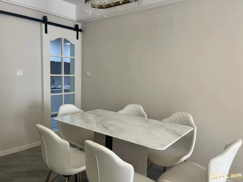 餐桌上方特意選亞克力吊燈,簡潔的色調,圓潤的外形,當暖黃色的燈光灑在餐桌上的時候,一粥一菜都變得溫暖起來.
