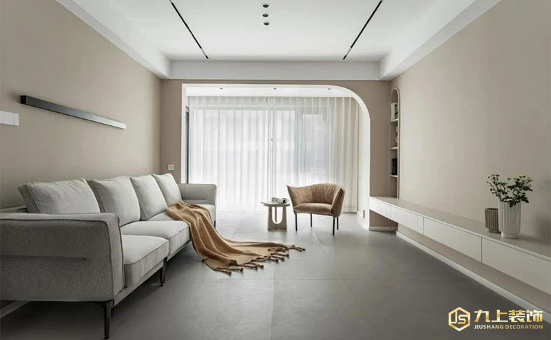 背景墻采用統(tǒng)一的奶油色藝術(shù)漆墻面,搭配灰色的布藝主沙發(fā),壁燈修飾背景墻面,輔以一抹卡其色的毛毯,營(yíng)造出現(xiàn)代舒適感。