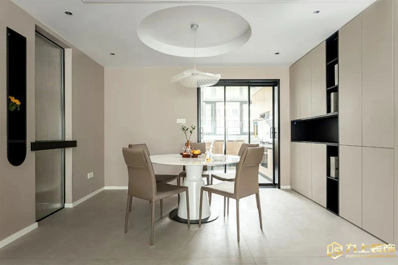 餐廳,在色調(diào)和材質(zhì)上延續(xù)了客廳的風(fēng)格,以通透的玻璃移門隔開廚房,定制整面餐邊柜,實(shí)現(xiàn)大體量收納化,溫暖舒適的感覺撲面而來(lái)。