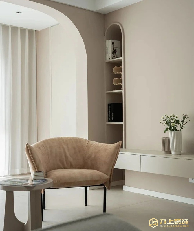電視墻延續(xù)溫馨的藝術(shù)漆色調(diào),設(shè)計(jì)一組拱形壁龕置物展示區(qū),搭配懸浮電視柜,兼顧收納與裝飾,棕色單椅和小圓幾打造休閑一隅。