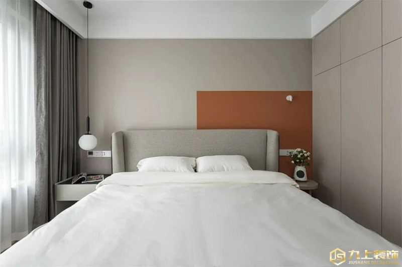 主臥,背景設(shè)計(jì)大膽的色彩拼接,增加墻面的美觀性和趣味性,搭配設(shè)計(jì)感的床頭柜,側(cè)面定制一體化收納衣柜,打造清爽大方的睡眠氛圍。
