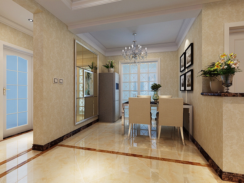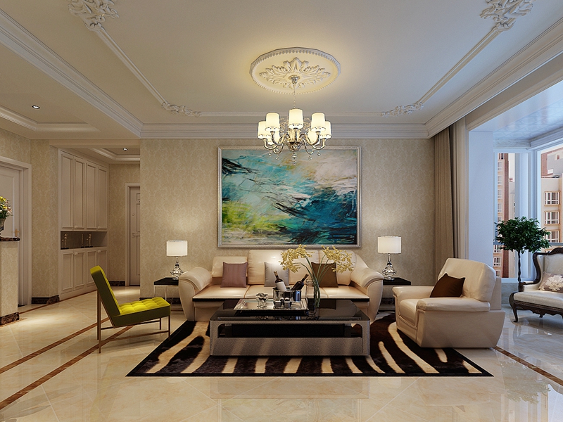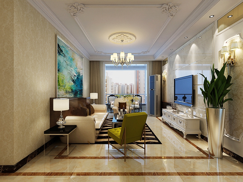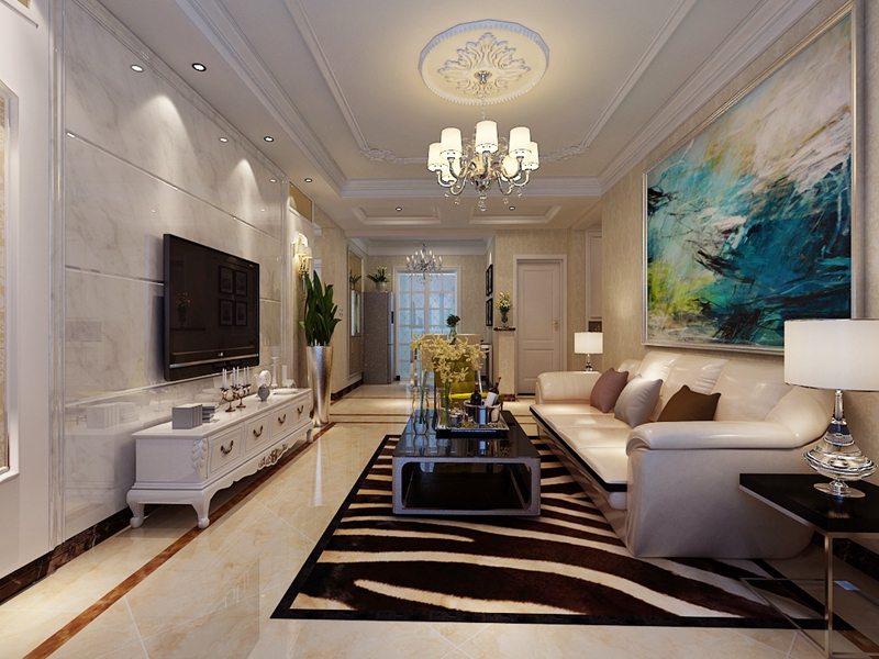 全屋貼的精美壁紙,電視背景墻則選用大理石做造型,沒有過多的吊頂,繁華的吊燈配上一圈石膏線,簡單卻也烘托了氛圍