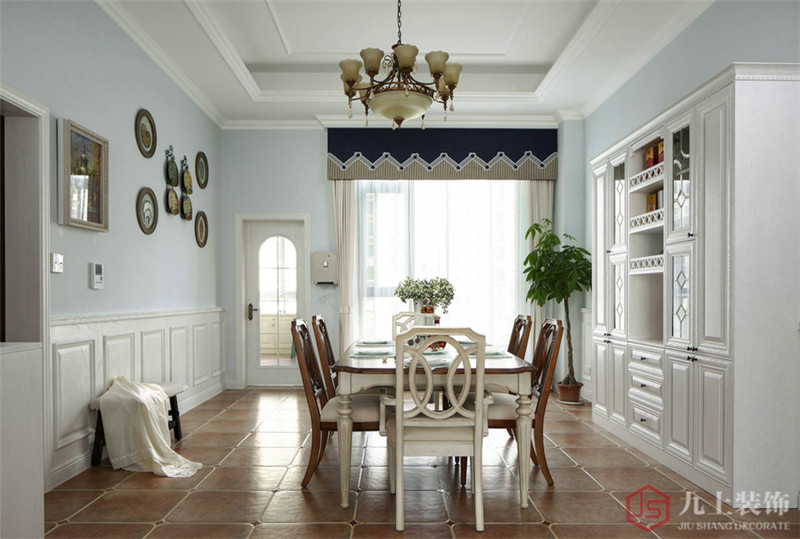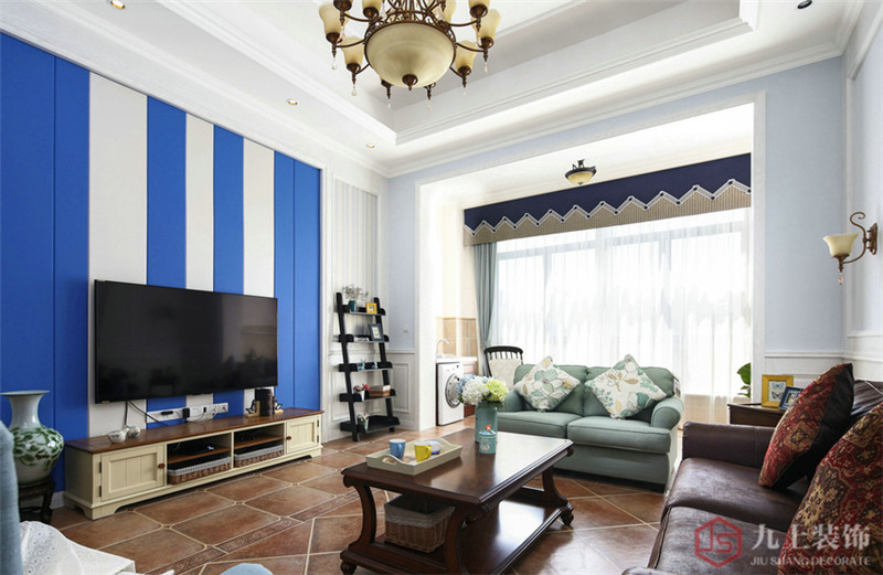 這是一套美式風(fēng)格的三房,用海藍(lán)色奠定全屋基調(diào),推開門,迎面而來的仿佛是咸咸的海風(fēng),清爽無比,