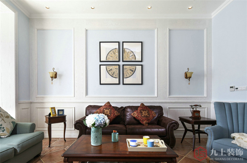背景墻講究對稱設(shè)計,以淺色藍(lán)色刷墻,配合略顯復(fù)古的沙發(fā),茶幾,營造休閑放松的氛圍。