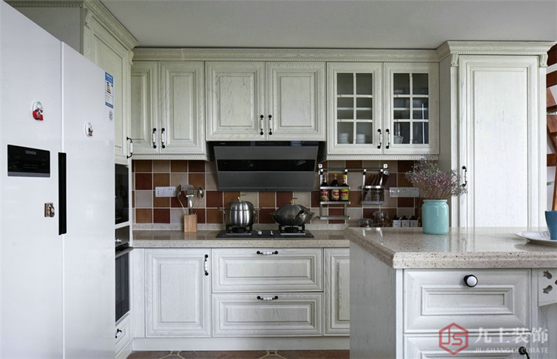 白色木紋櫥柜,滿滿的美式氣息,復(fù)古的小方磚,是美式風(fēng)格裝修的寵兒,除了寬敞,通透,廚房的收納也不可忽視。