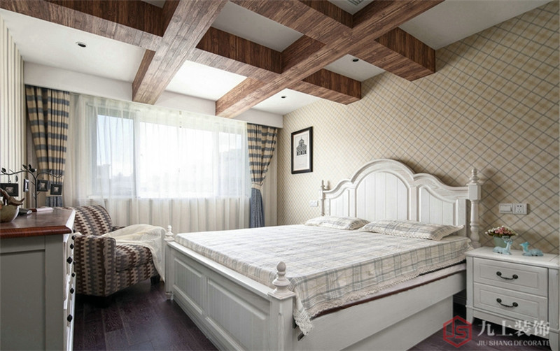 木質(zhì)的井字吊頂,是暖色主臥里的一抹驚艷,讓房間擺脫平凡這一招就足夠了。