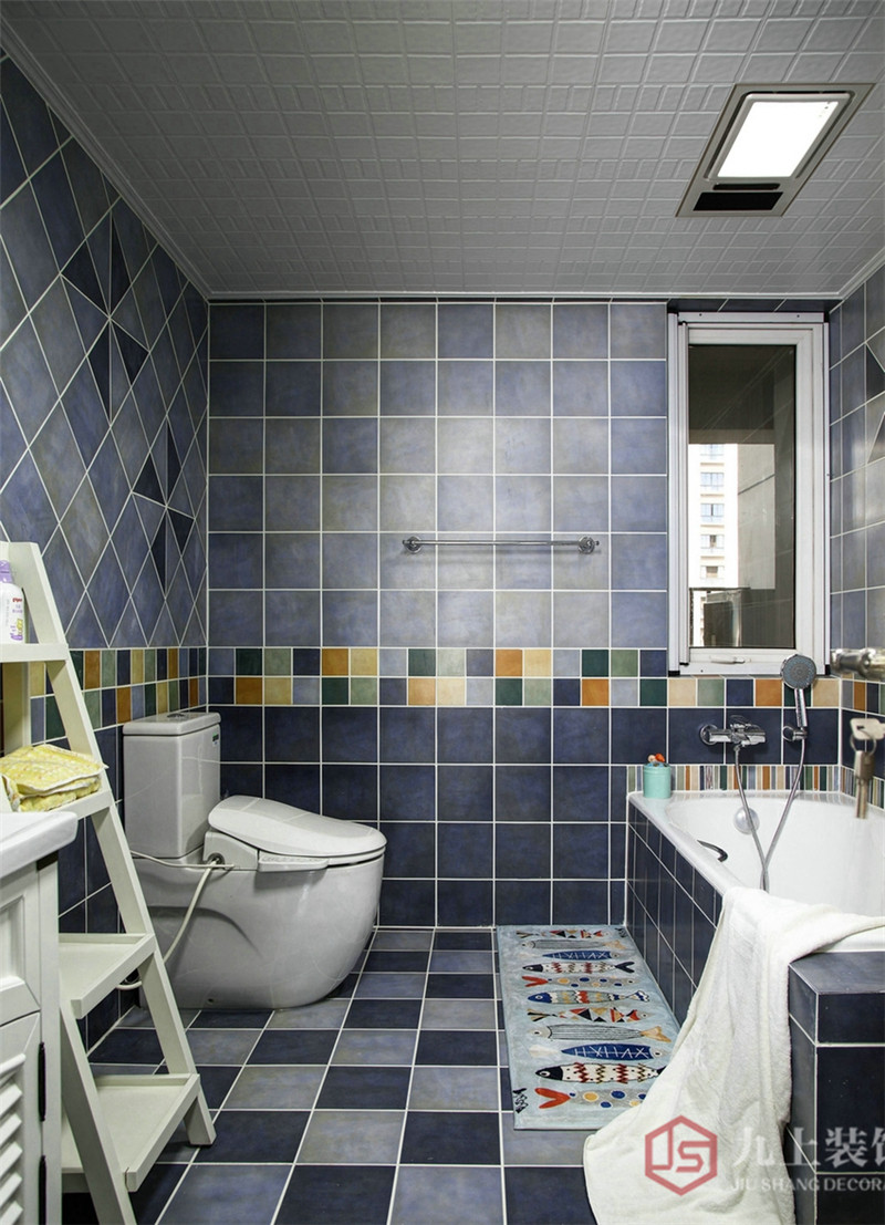 衛(wèi)生間偏地中海,彩色的小方磚令略顯深沉的空間,多了一點活躍和明媚。