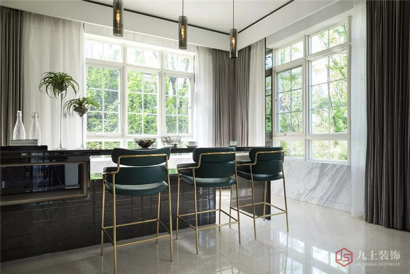 金色的細(xì)椅腿,搭配祖母綠軟包,空間抒寫著優(yōu)雅情調(diào)。色澤深邃的大理石桌柜連接墻體與地面,品質(zhì)承襲之余,亦平衡了設(shè)計(jì)的美學(xué)與功能特性。