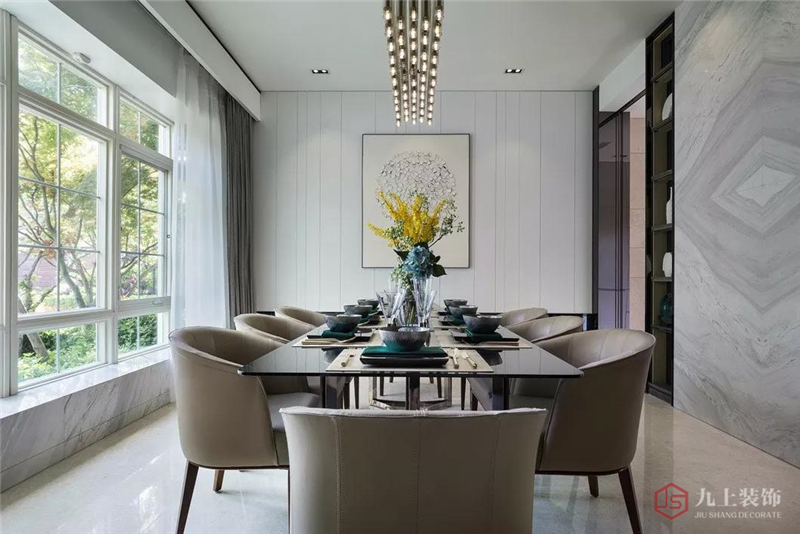 餐廳的設(shè)計(jì)中,淺棕與米白搭配,跳舞蘭的明黃與貝殼花的淺藍(lán)加以提亮,窗外引入的綠意自然而舒適,空間氣質(zhì)簡約優(yōu)雅且品味不凡。
