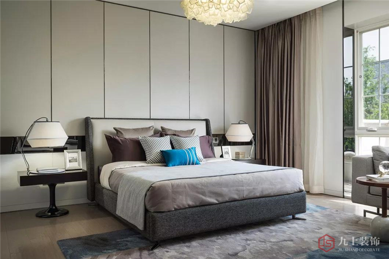 主臥空間的色彩上以深厚的棕色為主,空間中每一個(gè)家具都優(yōu)雅精致,每一盞燈飾設(shè)計(jì)均別具一格,以現(xiàn)代美學(xué)語匯的雅致與時(shí)尚簡潔,營造著流麗典雅的氣韻。