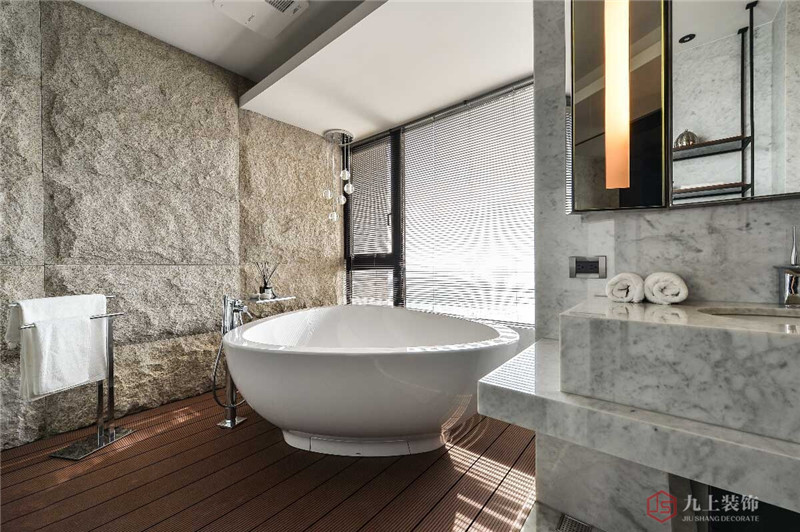雙臺面的設(shè)計(jì)與臨景的獨(dú)立浴缸,給衛(wèi)浴空間帶來便利的私密感受