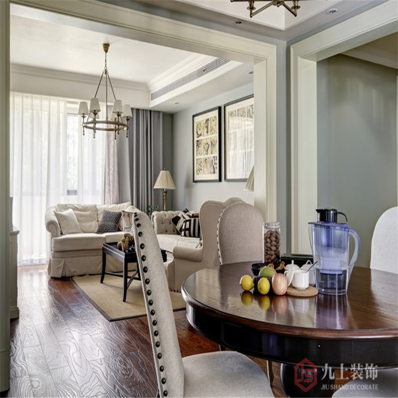 體現(xiàn)田園的清新淡雅,采用壁紙、仿古磚、布藝沙發(fā)、實(shí)木復(fù)合地板等,營造出一種田園氛圍