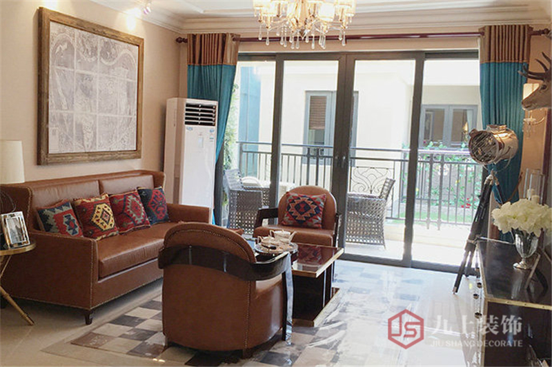 客廳皮沙發(fā)搭配顏色艷麗的抱枕,淺色壁畫,舒適休閑。