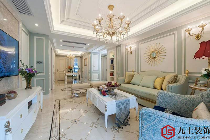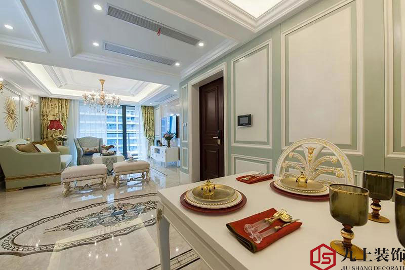今天給大家推薦一套輕奢簡歐風(fēng)案例,一個帶著春天般氣息的輕奢歐美風(fēng),敞亮清新。業(yè)主一家剛裝修完,現(xiàn)在已經(jīng)迫不及待要住進去了。客廳,敞亮而富有內(nèi)涵;背景墻采用淺綠色乳膠漆+白色石膏線勾勒古典層次。