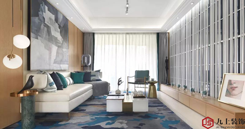 客廳一整面的白色木格柵底稱灰鏡,黑白格構(gòu)成給人強(qiáng)烈的視覺沖擊,再配以賈科梅蒂的雕塑——《行走的人》,來表達(dá)出一種理性的思考。